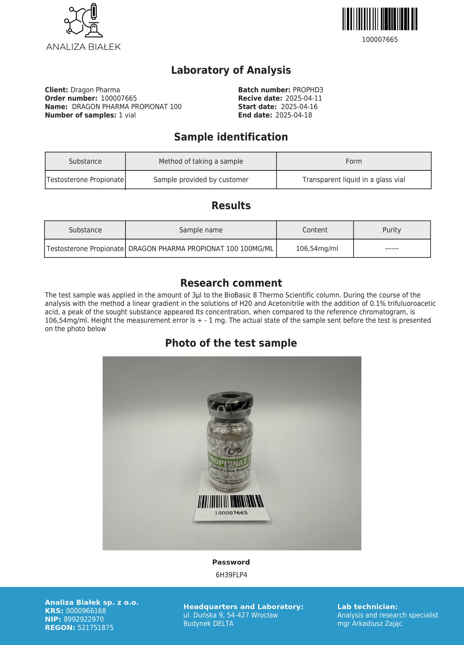 Propionat 100 by Dragon Pharma contains Testosterone Propionate, a fast-acting testosterone ester known for its ability to promote rapid muscle growth, strength, and enhanced performance. Each 10 ml vial delivers 100 mg/ml, making it a versatile choice for bodybuilders aiming for a strong, defined physique in both bulking and cutting cycles. With a half-life of approximately 2–3 days, it delivers quick results with frequent injections.