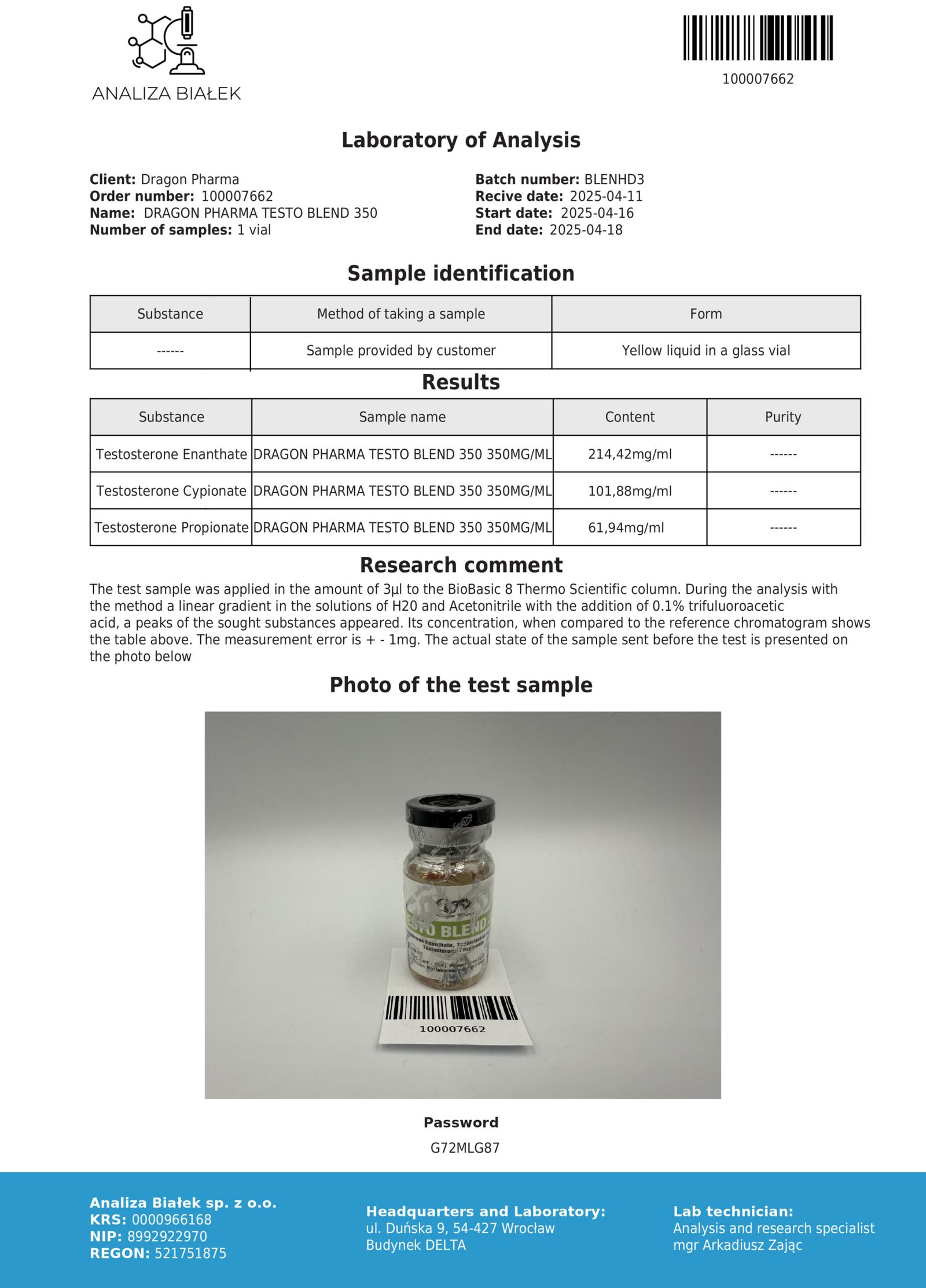 Testo Blend 350 combines fast and long-acting esters to provide an initial testosterone surge from Propionate, followed by sustained release from Cypionate and Enanthate. It binds to androgen receptors, enhancing protein synthesis and nitrogen retention for muscle growth, while increasing red blood cell production for improved endurance. Its aromatization to estrogen may cause water retention, requiring management. Detection time is up to 3–4 months due to long-acting esters.